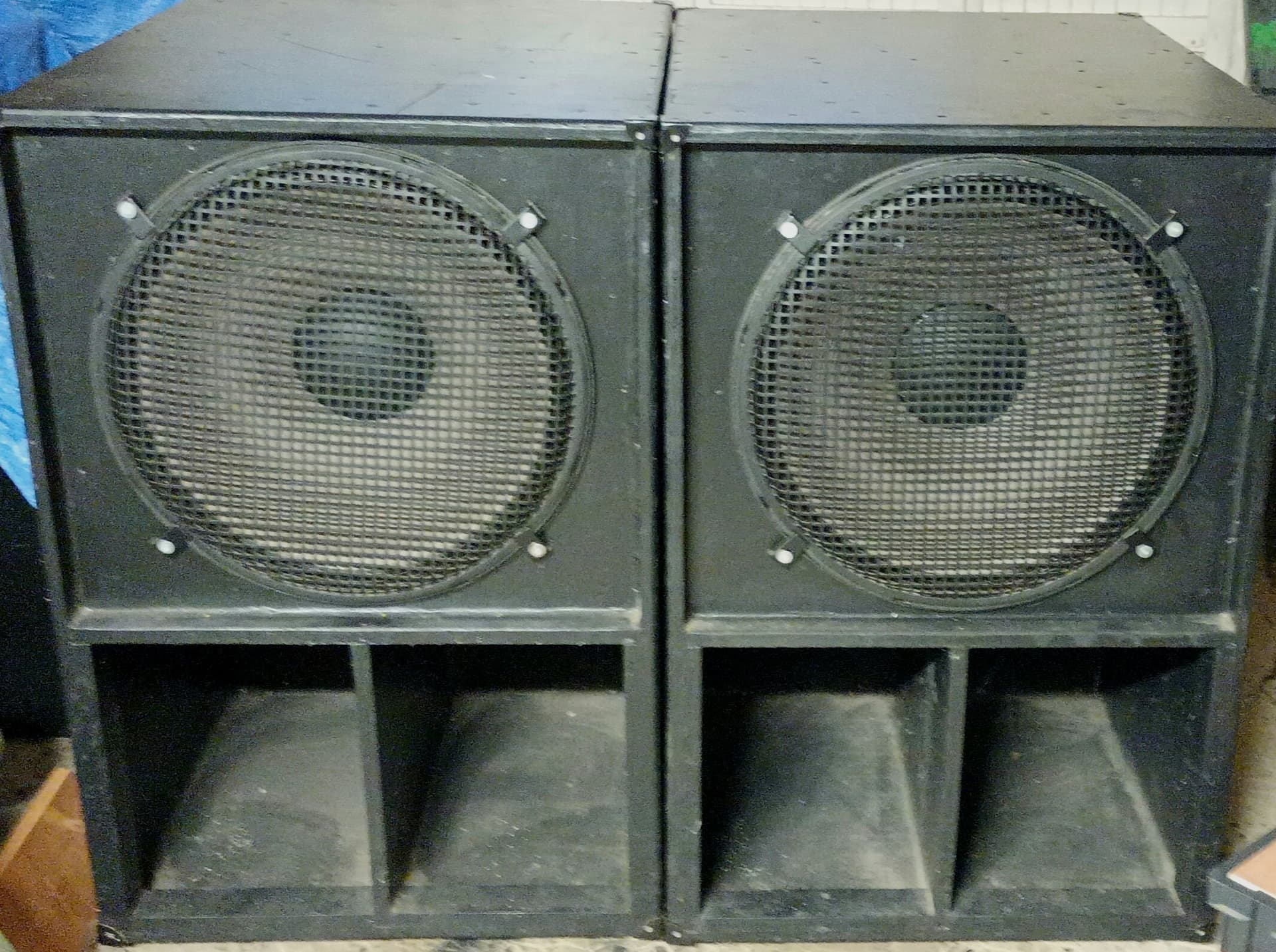 2 caissons de basse mini scoop (plan MS46) avec 2 hp the box 18-500, 500 watts RMS 2000w cobtreplatreplaqué 18mm, collés et vissés, poignées roulettes, embases speak on pour linker les 2 caissons. Dimensions 93x60x75