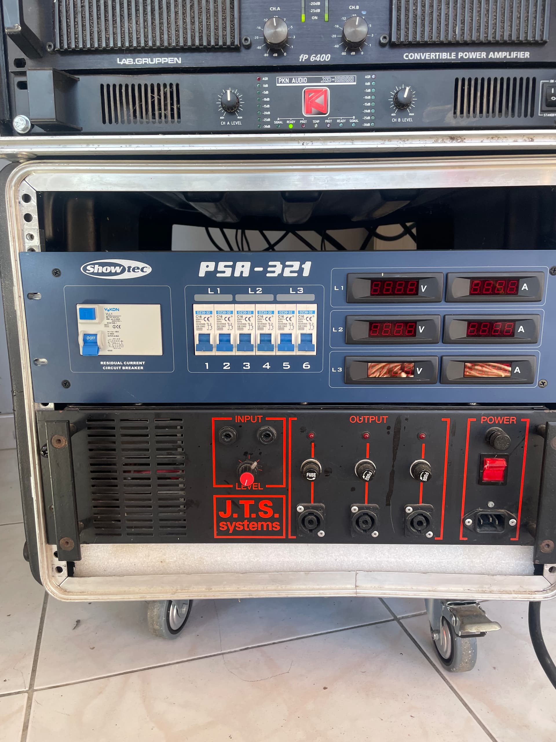 Alimentation classique en 220 ou triphasé PSA 321 + rallonge 10m. Cablage sono en 2,5mm2 sur 10m. et en 4*4mm2 sur 25m